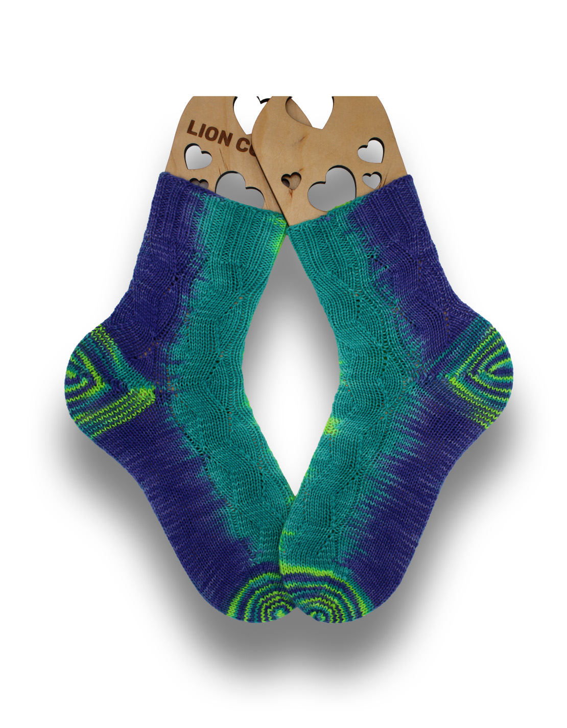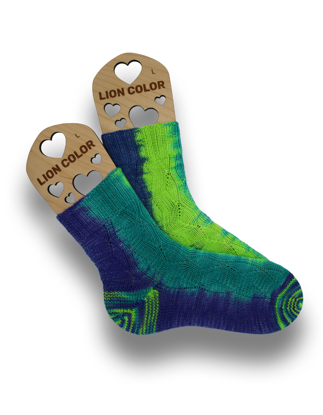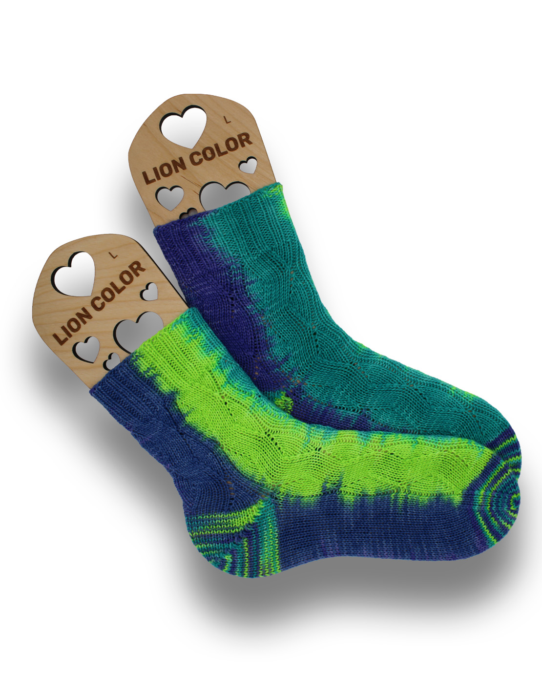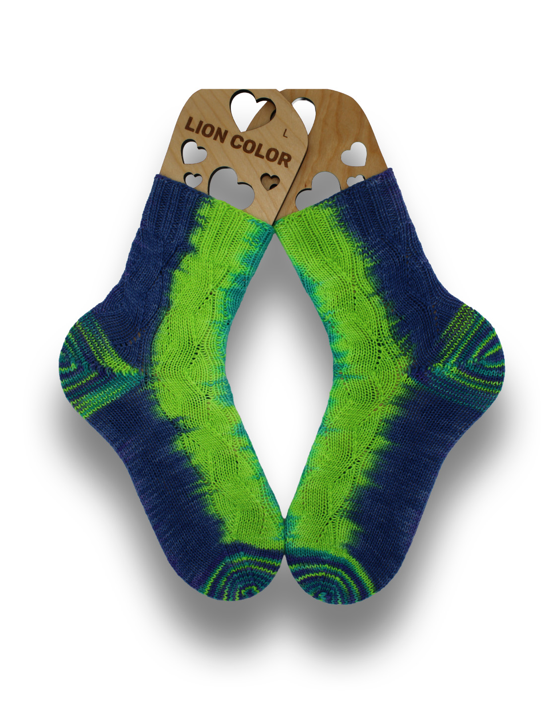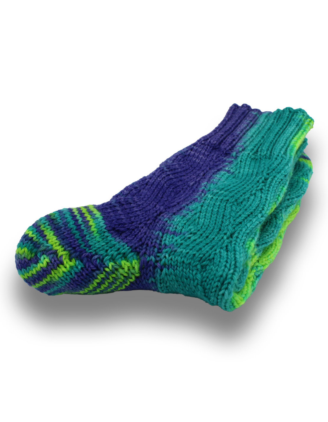 treffen ohne Übergang aufeinander und erzeugen beim Verstricken ein lebendiges Farbspiel. Die vier Farbbereiche ziehen als lebendige Streifen den Socken hinunter – ganz typisch für wildernde Färbungen.